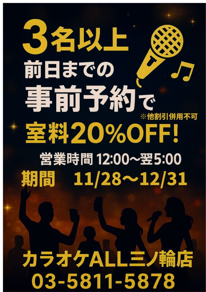 店舗SNS WEB予約 03-5811-5878 東京メトロ日比谷線「三ノ輪駅」3番出口より徒歩4分 詳細情報料金表キャンペーン年末年始料金期間 設置機種LIVEDAM WAO!、LIVEDAM AiR、LIVEDAM Ai、JOYSOUND MAXGO 部屋数9部屋(パーティールームあり)定休日年中無休住所〒116-0003東京都荒川区南千住1-15-4-3Fアクセス東京メトロ日比谷線「三ノ輪駅」3番出口より徒歩4分営業時間12:00~翌05:00決済方法現金クレジットカード (JCB,VISA,Master,AMEX)交通系ICPayPayQUICPay駐輪場/駐車場なしその他 設備・サービス Wi-Fi 学割 シニア割引 未就学児無料 小学生半額 ドリンクバー無料 フード持込無料 障がい者手帳割引 楽器演奏可 プロジェクタールーム コンセント利用可 スマホ充電器貸出 貸出楽器あり 誕生日特典あり プロジェクタHDMI スマホ接続 Blu-ray ダーツ クレーンゲーム ソフトクリーム 道順てみ 道順 東京メトロ日比谷線「三ノ輪駅」を出て、国道4号を千住大橋方面へ進んでいただくと左手ビル3階に当店がございます。1階がファミリーマートさんのビルです。 平日 平日 昼 お一人様 30分料金 通常一般210円(税込)学生170円(税込)ヒトカラ270円(税込) お一人様 フリータイム料金 12:00~19:00※3時間保証制 通常一般1,080円(税込)学生880円(税込)ヒトカラ1,380円(税込) 平日 夜 お一人様30分料金 通常飲み放題(室料込)一般370円(税込)650円(税込)学生(会員)320円(税込)650円(税込)ヒトカラ450円(税込)650円(税込) お一人様 フリータイム料金 19:00~ 通常飲み放題(室料込)一般1,900円(税込)3,400円(税込)学生(会員)1,700円(税込)3,400円(税込)ヒトカラ2,700円(税込)3,900円(税込) 週末・祝前日 週末 昼 お一人様 30分料金 通常一般240円(税込)学生(会員)200円(税込)ヒトカラ400円(税込) お一人様 フリータイム料金 ※3時間保証制 通常一般1,300円(税込)学生(会員)1,000円(税込) 週末 夜 お一人様30分料金 通常飲み放題(室料込)一般450円(税込)730円(税込)学生(会員)400円(税込)730円(税込)ヒトカラ550円(税込)730円(税込) お一人様 フリータイム料金※土曜・連休中日 22:00受付開始※ヒトカラ 24:00受付開始 通常飲み放題(室料込)一般2,350円(税込)3,800円(税込)学生(会員)2,100円(税込)3,800円(税込)ヒトカラ3,300円(税込)4,380円(税込) 非会員様は、別料金となり上記料金に、時間利用で30分ごと+200円、フリータイムのご利用で+500円となります。 お昼のフリータイムは3時間保証とさせていただいております。混雑時には、ご利用時間を制限させていただく場合がございます。 お酒持込の場合は飲み放題コースでのご案内となっております。 年末年始は特別料金となる可能性がございます。 そのほか、料金に関しては、あらかじめお電話でご確認ください。 ※学生料金は、学生証または学生定期券のご提示、学生服を着用されているお客様、義務教育のお客様が対象となります。 ※未成年のご利用は、各都道府県の条例又は自主規制に基づき運営しております。 ※18歳以下(当年度高校3年生の世代以下)含むグループは保護者同伴であっても22時受付終了とさせていただいております。 ※途中入室・退室をされた場合もフリータイムの料金は一律となります。 ※混雑状況によりご案内できない場合がございます。 忘年会シーズン、事前割引予約はじめました! 下記の日程は年末年始特別料金でのご案内となります。 11月28.29.30日 12月5.6.7日12.13.14日19日~1月12日 11月28日、12月5.12.19日は19時まで通常料金となります。 1月5~8日は19時以降通常料金となります。 上記の期間は夜フリータイムの受付開始が23時からとなります。(12月22日~25日は19時から) 営業時間について 変更なし。大晦日、正月も通常通りの営業です。 ご予約の際は日時確定の上、お電話ください。 未就学児は人数に含まれません。 当日のご予約の場合は通常のご案内となります。 お電話の際、「キャンペーンを見た」とお伝えいただけると非常に有難いです。 ご希望日時の予約状況によってはご予約承れない場合がございます。 機種や部屋のご指定は可能な限りご希望に沿えるよう尽力いたしますが、混雑状況によってはご希望に沿えない場合がございます。 上記期間一部年末年始特別料金となります。